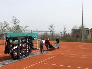 Damit es keine Platzbeschädigungen durch die Raupen des Steigers gab, wurden extra große PVC-Platten verlegt, welche nicht leicht waren und mehrmals verlegt werden mussten!