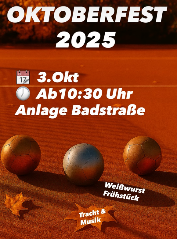 wir möchten euch recht herzlich zu unserem traditionellen Oktoberfest mit Boule-Turnier, Weißwurstessen, Tracht und Co. auf unserer Tennisanlage in der Badstraße einladen.