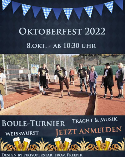 wir möchten euch recht herzlich zu unserem traditionellen Oktoberfest mit Boule-Turnier, Weißwurstessen, Tracht und Co. auf unserer Tennisanlage in der Badstraße einladen.